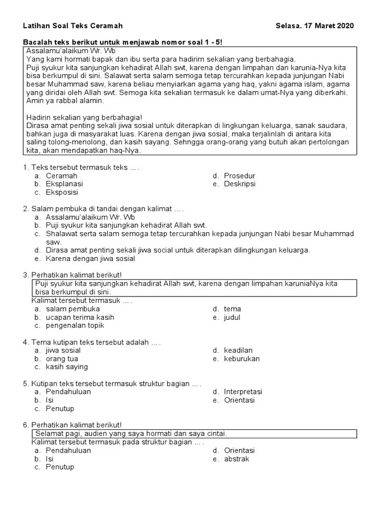 Di dalam bahasa indonesia, kita mempelajarinya dalam materi teks ceramah dan contoh teks ceramah. Contoh soal teks ceramah beserta jawabannya. Hadirin yang saya hormati, dalam kesempatan ini saya akan membahas perlunya keseimbangan antara kebutuhan jasmani dan rohani. (1) Informasi yang terdapat pada teks ceramah tersebut adalah…. Kalau kamu mau cari soal latihan bahasa indonesia kelas 11.