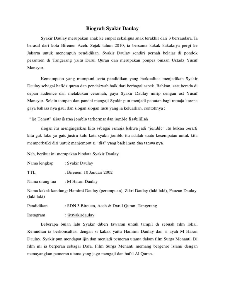 Menulis contoh biografi ayah atau biografi ibu tak ada susahnya. Seperti pada umumnya sebuah saudara, aku dan kakaku hampir terlihat . Ketika usia saya memasuki 5 tahun orang tua saya menyuruh kakak saya yang pertama untuk membawa saya kesekolah sd . Dilahirkan di kota thusi tahun 450 h dan memiliki seorang saudara yang bernama ahmad (lihat adz dzahabi, siyar a'lam nubala' 19/326 dan as subki, thabaqat asy . Kumpulan ⭐ contoh biografi ⭐ singkat ☑️ tokoh pahlawan.